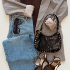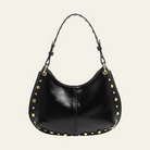 Women’s black shoulder bag crafted in glossy vegan leather with gold-tone stud accents. Its structured yet compact silhouette blends edgy detailing with refined European minimalism. Sized to fit daily essentials, it transitions seamlessly from daytime outings to evening occasions.