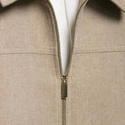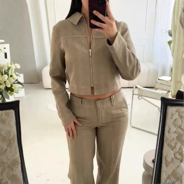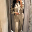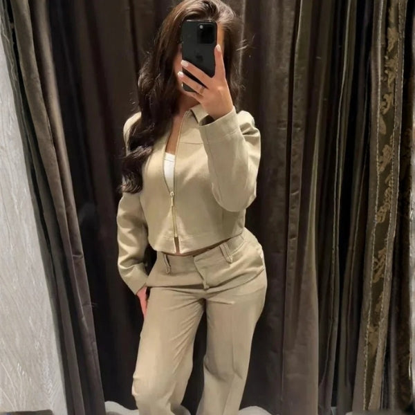 Womens two-piece set featuring a cropped jacket and tailored trousers in beige.