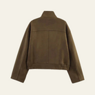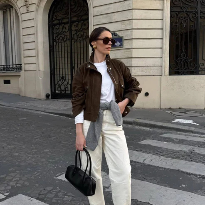 A contemporary womens bomber jacket in suede design, crafted for modern city layers.