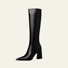 Womens knee-high leather boot with pointed toe and block heel for elevated city elegance. Crafted in smooth leather with sleek lines, offering refined structure and lasting comfort. Perfect with tailored coats, evening wear, or statement day-to-night looks.
