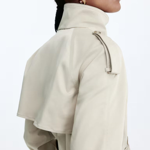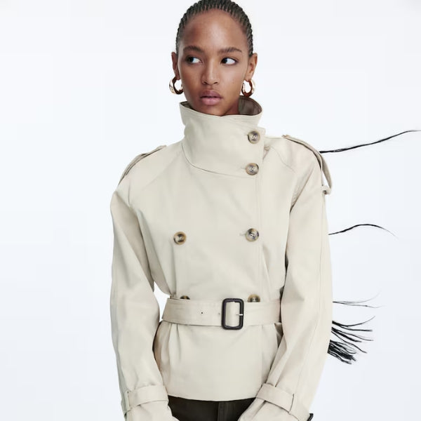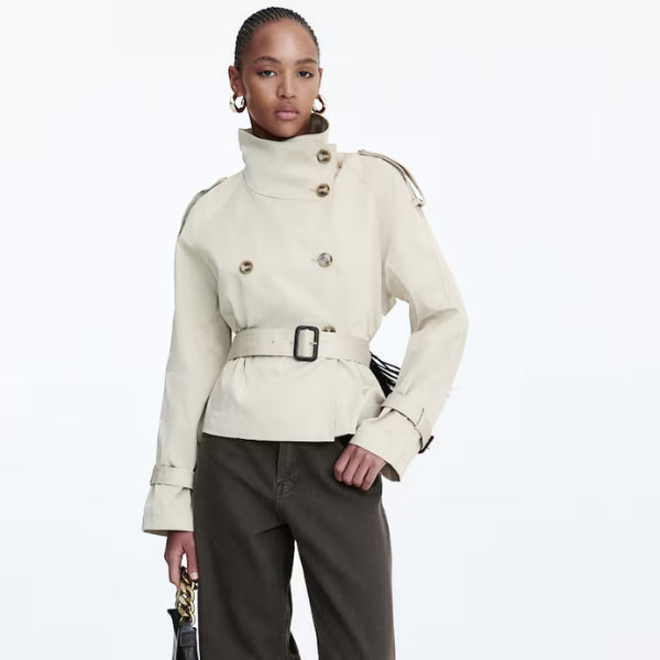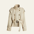 Crafted with double-breasted tailoring, epaulettes, and refined buckle detailing for a timeless finish.